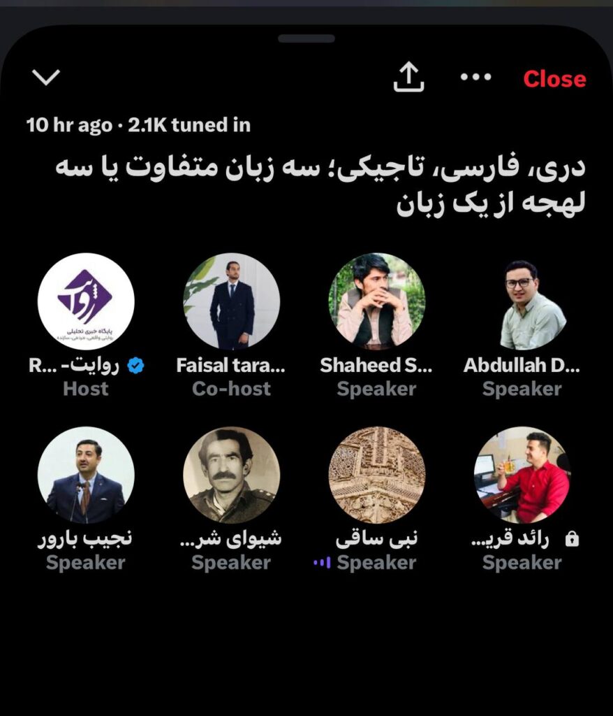 برنامه کافه پرسش پایگاه خبری تحلیلی روایت شب گذشته سهشنبهشب (۲۷ عقرب/آبان) در صفحه ایکس این پایگاه با حضور شماری از نویسندگان، شاعران و پژوهشگران برگزار شد. موضوع این نشست یکی از بحثهای دیرینه و حساس در حوزه زبان و فرهنگ بود: آیا فارسی، دری و تاجیکی سه زبان مستقلاند یا سه لهجه از یک زبان واحد؟ مهمانان این برنامه شامل شیوای شرق، نجیب بارور، نبی ساقی، رائد قریشی، دکتر محیالدین مهدی و داود عرفان بودند.