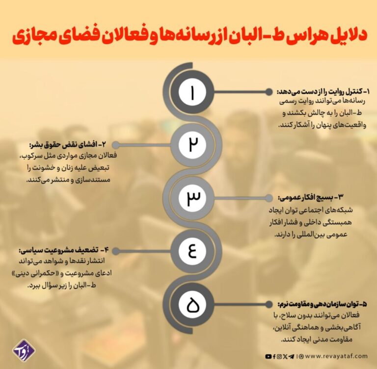 ۱- کنترل روایت را از دست میدهد: رسانهها میتوانند روایت رسمی طالبان را به چالش بکشند و واقعیتهای پنهان را آشکار کنند. ۲- افشای نقض حقوق بشر: فعالان مجازی مواردی مثل سرکوب، تبعیض علیه زنان و خشونت را مستندسازی و منتشر میکنند. ۳- بسیج افکار عمومی: شبکههای اجتماعی توان ایجاد همبستگی داخلی و فشار افکار عمومی بینالمللی را دارند. ۴- تضعیف مشروعیت سیاسی: انتشار نقدها و شواهد میتواند ادعای مشروعیت و «حکمرانی دینی» طالبان را زیر سؤال ببرد. ۵- توان سازماندهی و مقاومت نرم: فعالان میتوانند بدون سلاح، با آگاهیبخشی و هماهنگی آنلاین، مقاومت مدنی ایجاد کنند.
