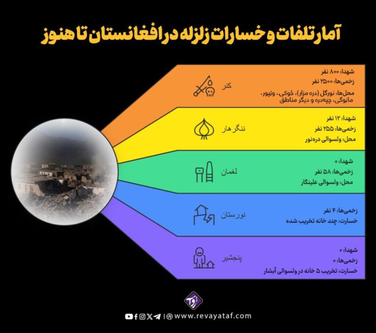 🟥 کنر شهدا: ۸۰۰ نفر زخمیها: ۲۵۰۰ نفر محلها: نورگل (دره مزار)، څوکۍ، وټپور، ماڼوگی، چپهدره و دیگر مناطق 🟧 ننگرهار شهدا: ۱۲ نفر زخمیها: ۲۵۵ نفر محل: ولسوالی درهنور 🟨 لغمان شهدا: ۰ زخمیها: ۵۸ نفر محل: ولسوالی علینگار 🟩 نورستان زخمیها: ۴ نفر خسارت: چند خانه تخریب شده 🟦 پنجشیر شهدا: ۰ زخمیها: ۰ خسارت: تخریب ۵ خانه در ولسوالی آبشار