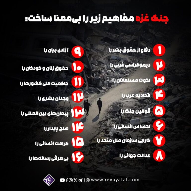 ۱. دفاع از حقوق بشر را ۲. دیموکراسی غربی را ۳. اخوت مسلمانان را ۴. اتحادیه عرب را ۵. قوانین جنگ را ۶. احساس انسانی را ۷. کارایی سازمان ملل متحد را ۸. عدالت جهانی را ۹. آزادی بیان را ۱۰. حقوق زنان و کودکان را ۱۱. حاکمیت ملی کشورها را ۱۲ وجدان بشری را ۱۳ پیمانهای بینالمللی را ۱۴. صلح پایدار را ۱۵. کرامت انسانی را ۱۶ بیطرفی رسانهها را