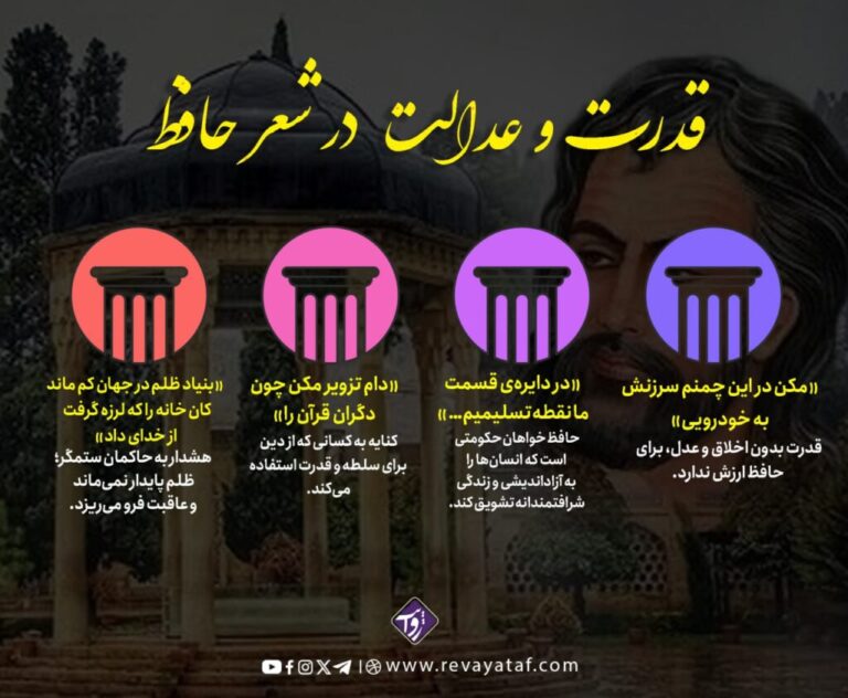 «مکن در این چمنم سرزنش به خودرویی» قدرت بدون اخلاق و عدل، برای حافظ ارزش ندارد. «در دایرهی قسمت ما نقطه تسلیمیم…» حافظ خواهان حکومتی است که انسانها را به آزاداندیشی و زندگی شرافتمندانه تشویق کند. «دام تزویر مکن چون دگران قرآن را» کنایه به کسانی که از دین برای سلطه و قدرت استفاده میکند. «بنیاد ظلم در جهان کم ماند کان خانه را که لرزه گرفت از خدای داد» هشدار به حاکمان ستمگر؛ ظلم پایدار نمیماند و عاقبت فرو میریزد.